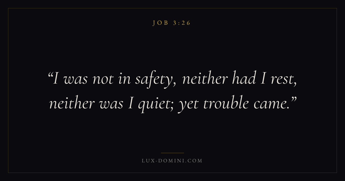Books / Job / Chapter 3 / Verse 26 ← Job 3:25 Job 3:26 Job 4:1 → I was not in safety, neither had I rest, neither was I quiet; yet trouble came. Download verse card Share on Twitter Share on Facebook Pin it ✦ Key themes HopeSuffering and trialsWisdomJustice and mercySuffering Read with Job 3:23Job 3:24Romans 8:24Revelation 21:4 Related topics Bible verses about hopeBible verses about suffering and trialsBible verses about wisdomBible verses about justice and mercy ✦ Job Chapter 3 verses V. 1 V. 2 V. 3 V. 4 V. 5 V. 6 V. 7 V. 8 V. 9 V. 10 V. 11 V. 12 V. 13 V. 14 V. 15 V. 16 V. 17 V. 18 V. 19 V. 20 V. 21 V. 22 V. 23 V. 24 V. 25 V. 26