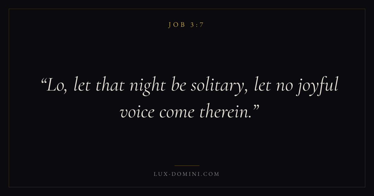Books / Job / Chapter 3 / Verse 7 ← Job 3:6 Job 3:7 Job 3:8 → Lo, let that night be solitary, let no joyful voice come therein. Download verse card Share on Twitter Share on Facebook Pin it ✦ Key themes Suffering and trialsWisdomJustice and mercySuffering Read with Job 3:6Job 3:8Romans 8:182 Corinthians 4:17 Related topics Bible verses about suffering and trialsBible verses about wisdomBible verses about justice and mercy ✦ Job Chapter 3 verses V. 1 V. 2 V. 3 V. 4 V. 5 V. 6 V. 7 V. 8 V. 9 V. 10 V. 11 V. 12 V. 13 V. 14 V. 15 V. 16 V. 17 V. 18 V. 19 V. 20 V. 21 V. 22 V. 23 V. 24 V. 25 V. 26