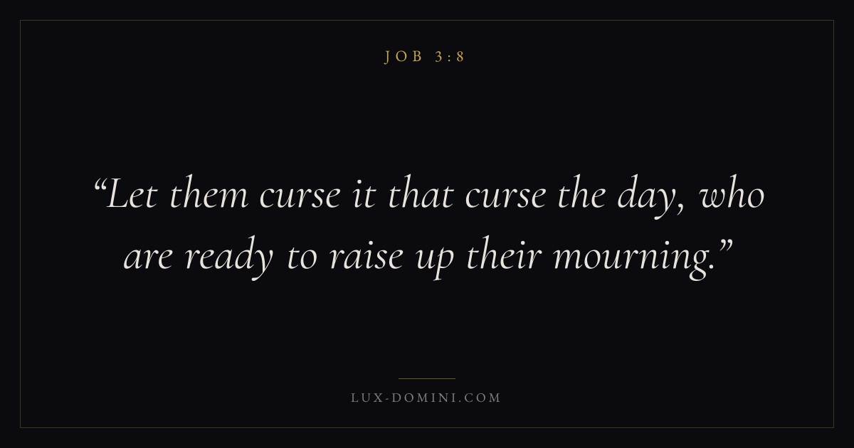 Books / Job / Chapter 3 / Verse 8 ← Job 3:7 Job 3:8 Job 3:9 → Let them curse it that curse the day, who are ready to raise up their mourning. Download verse card Share on Twitter Share on Facebook Pin it ✦ Key themes Suffering and trialsWisdomJustice and mercySuffering Read with Job 3:6Job 3:7Romans 8:182 Corinthians 4:17 Related topics Bible verses about suffering and trialsBible verses about wisdomBible verses about justice and mercy ✦ Job Chapter 3 verses V. 1 V. 2 V. 3 V. 4 V. 5 V. 6 V. 7 V. 8 V. 9 V. 10 V. 11 V. 12 V. 13 V. 14 V. 15 V. 16 V. 17 V. 18 V. 19 V. 20 V. 21 V. 22 V. 23 V. 24 V. 25 V. 26