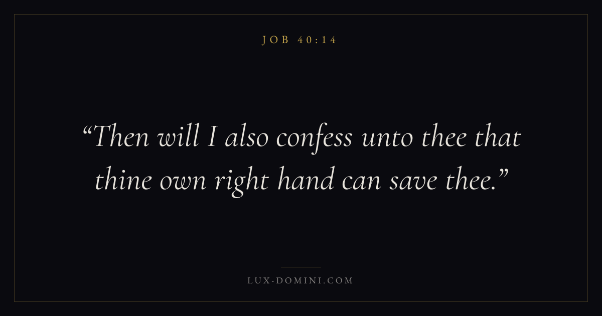 Books / Job / Chapter 40 / Verse 14 ← Job 40:13 Job 40:14 Job 40:15 → Then will I also confess unto thee that thine own right hand can save thee. Download verse card Share on Twitter Share on Facebook Pin it ✦ Key themes Suffering and trialsWisdomJustice and mercySalvationSuffering Read with Job 40:13Romans 8:182 Corinthians 4:17Proverbs 1:7 Related topics Bible verses about suffering and trialsBible verses about wisdomBible verses about justice and mercyBible verses about salvation ✦ Job Chapter 40 verses V. 1 V. 2 V. 3 V. 4 V. 5 V. 6 V. 7 V. 8 V. 9 V. 10 V. 11 V. 12 V. 13 V. 14 V. 15 V. 16 V. 17 V. 18 V. 19 V. 20 V. 21 V. 22 V. 23 V. 24