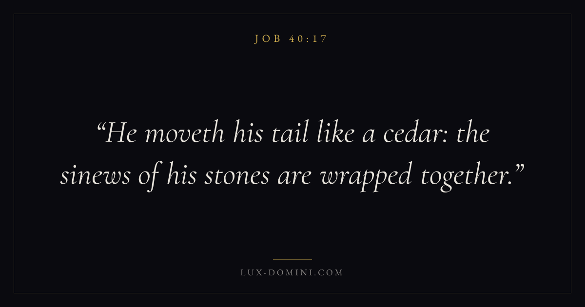 Books / Job / Chapter 40 / Verse 17 ← Job 40:16 Job 40:17 Job 40:18 → He moveth his tail like a cedar: the sinews of his stones are wrapped together. Download verse card Share on Twitter Share on Facebook Pin it ✦ Key themes Suffering and trialsWisdomJustice and mercySuffering Read with Job 40:18Romans 8:182 Corinthians 4:17Proverbs 1:7 Related topics Bible verses about suffering and trialsBible verses about wisdomBible verses about justice and mercy ✦ Job Chapter 40 verses V. 1 V. 2 V. 3 V. 4 V. 5 V. 6 V. 7 V. 8 V. 9 V. 10 V. 11 V. 12 V. 13 V. 14 V. 15 V. 16 V. 17 V. 18 V. 19 V. 20 V. 21 V. 22 V. 23 V. 24