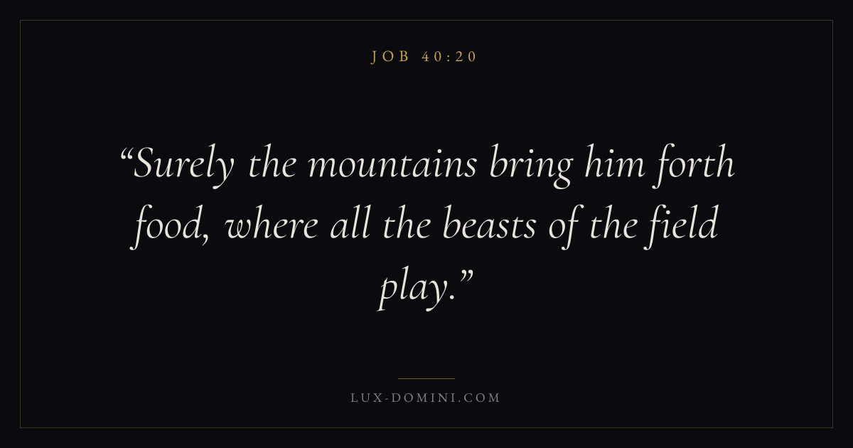 Books / Job / Chapter 40 / Verse 20 ← Job 40:19 Job 40:20 Job 40:21 → Surely the mountains bring him forth food, where all the beasts of the field play. Download verse card Share on Twitter Share on Facebook Pin it ✦ Key themes Suffering and trialsWisdomJustice and mercySuffering Read with Job 40:19Romans 8:182 Corinthians 4:17Proverbs 1:7 Related topics Bible verses about suffering and trialsBible verses about wisdomBible verses about justice and mercy ✦ Job Chapter 40 verses V. 1 V. 2 V. 3 V. 4 V. 5 V. 6 V. 7 V. 8 V. 9 V. 10 V. 11 V. 12 V. 13 V. 14 V. 15 V. 16 V. 17 V. 18 V. 19 V. 20 V. 21 V. 22 V. 23 V. 24