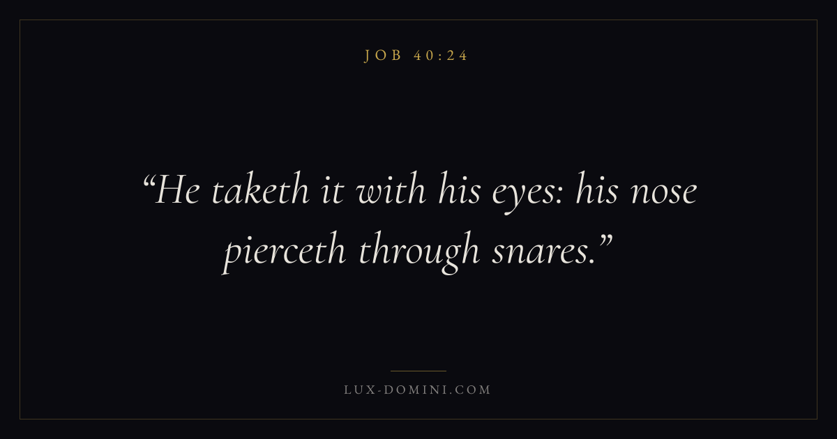 Books / Job / Chapter 40 / Verse 24 ← Job 40:23 Job 40:24 Job 41:1 → He taketh it with his eyes: his nose pierceth through snares. Download verse card Share on Twitter Share on Facebook Pin it ✦ Key themes Suffering and trialsWisdomJustice and mercySuffering Read with Job 40:23Romans 8:182 Corinthians 4:17Proverbs 1:7 Related topics Bible verses about suffering and trialsBible verses about wisdomBible verses about justice and mercy ✦ Job Chapter 40 verses V. 1 V. 2 V. 3 V. 4 V. 5 V. 6 V. 7 V. 8 V. 9 V. 10 V. 11 V. 12 V. 13 V. 14 V. 15 V. 16 V. 17 V. 18 V. 19 V. 20 V. 21 V. 22 V. 23 V. 24