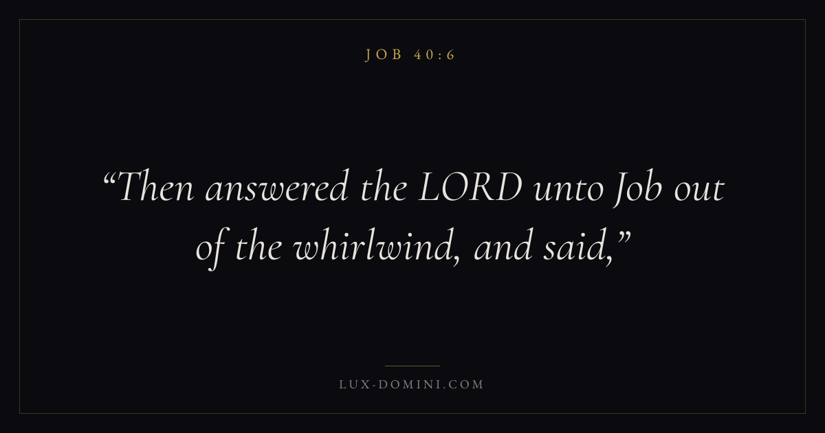 Books / Job / Chapter 40 / Verse 6 ← Job 40:5 Job 40:6 Job 40:7 → Then answered the LORD unto Job out of the whirlwind, and said, Download verse card Share on Twitter Share on Facebook Pin it ✦ Key themes Suffering and trialsWisdomJustice and mercySuffering Read with Job 40:7Romans 8:182 Corinthians 4:17Proverbs 1:7 Related topics Bible verses about suffering and trialsBible verses about wisdomBible verses about justice and mercy ✦ Job Chapter 40 verses V. 1 V. 2 V. 3 V. 4 V. 5 V. 6 V. 7 V. 8 V. 9 V. 10 V. 11 V. 12 V. 13 V. 14 V. 15 V. 16 V. 17 V. 18 V. 19 V. 20 V. 21 V. 22 V. 23 V. 24