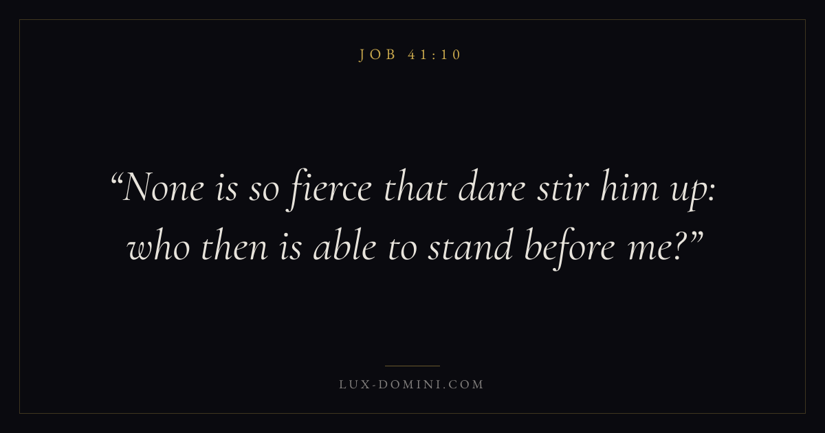 Books / Job / Chapter 41 / Verse 10 ← Job 41:9 Job 41:10 Job 41:11 → None is so fierce that dare stir him up: who then is able to stand before me? Download verse card Share on Twitter Share on Facebook Pin it ✦ Key themes Suffering and trialsWisdomJustice and mercySuffering Read with Job 41:9Romans 8:182 Corinthians 4:17Proverbs 1:7 Related topics Bible verses about suffering and trialsBible verses about wisdomBible verses about justice and mercy ✦ Job Chapter 41 verses V. 1 V. 2 V. 3 V. 4 V. 5 V. 6 V. 7 V. 8 V. 9 V. 10 V. 11 V. 12 V. 13 V. 14 V. 15 V. 16 V. 17 V. 18 V. 19 V. 20 V. 21 V. 22 V. 23 V. 24 V. 25 V. 26 V. 27 V. 28 V. 29 V. 30 V. 31 V. 32 V. 33 V. 34