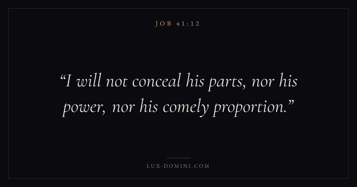 Books / Job / Chapter 41 / Verse 12 ← Job 41:11 Job 41:12 Job 41:13 → I will not conceal his parts, nor his power, nor his comely proportion. Download verse card Share on Twitter Share on Facebook Pin it ✦ Key themes Suffering and trialsWisdomJustice and mercySuffering Read with Job 41:11Romans 8:182 Corinthians 4:17Proverbs 1:7 Related topics Bible verses about suffering and trialsBible verses about wisdomBible verses about justice and mercy ✦ Job Chapter 41 verses V. 1 V. 2 V. 3 V. 4 V. 5 V. 6 V. 7 V. 8 V. 9 V. 10 V. 11 V. 12 V. 13 V. 14 V. 15 V. 16 V. 17 V. 18 V. 19 V. 20 V. 21 V. 22 V. 23 V. 24 V. 25 V. 26 V. 27 V. 28 V. 29 V. 30 V. 31 V. 32 V. 33 V. 34