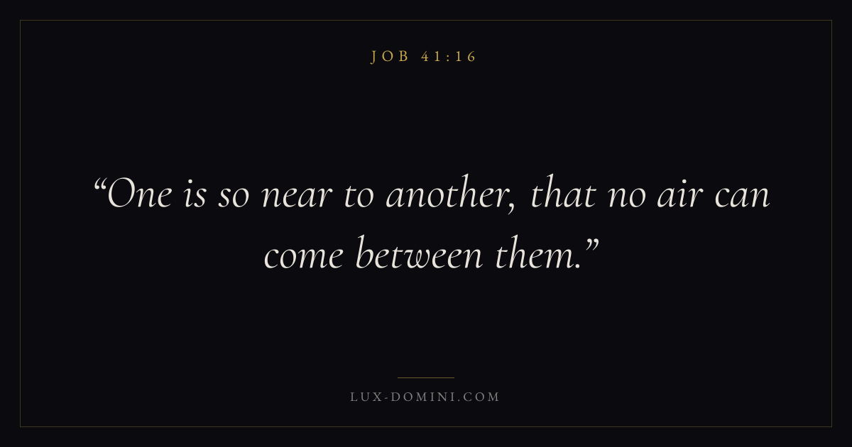 Books / Job / Chapter 41 / Verse 16 ← Job 41:15 Job 41:16 Job 41:17 → One is so near to another, that no air can come between them. Download verse card Share on Twitter Share on Facebook Pin it ✦ Key themes Suffering and trialsWisdomJustice and mercySuffering Read with Job 41:15Romans 8:182 Corinthians 4:17Proverbs 1:7 Related topics Bible verses about suffering and trialsBible verses about wisdomBible verses about justice and mercy ✦ Job Chapter 41 verses V. 1 V. 2 V. 3 V. 4 V. 5 V. 6 V. 7 V. 8 V. 9 V. 10 V. 11 V. 12 V. 13 V. 14 V. 15 V. 16 V. 17 V. 18 V. 19 V. 20 V. 21 V. 22 V. 23 V. 24 V. 25 V. 26 V. 27 V. 28 V. 29 V. 30 V. 31 V. 32 V. 33 V. 34