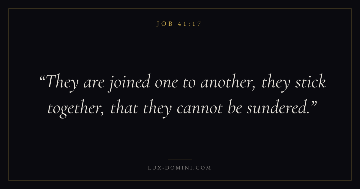 Books / Job / Chapter 41 / Verse 17 ← Job 41:16 Job 41:17 Job 41:18 → They are joined one to another, they stick together, that they cannot be sundered. Download verse card Share on Twitter Share on Facebook Pin it ✦ Key themes Suffering and trialsWisdomJustice and mercySuffering Read with Job 41:18Romans 8:182 Corinthians 4:17Proverbs 1:7 Related topics Bible verses about suffering and trialsBible verses about wisdomBible verses about justice and mercy ✦ Job Chapter 41 verses V. 1 V. 2 V. 3 V. 4 V. 5 V. 6 V. 7 V. 8 V. 9 V. 10 V. 11 V. 12 V. 13 V. 14 V. 15 V. 16 V. 17 V. 18 V. 19 V. 20 V. 21 V. 22 V. 23 V. 24 V. 25 V. 26 V. 27 V. 28 V. 29 V. 30 V. 31 V. 32 V. 33 V. 34