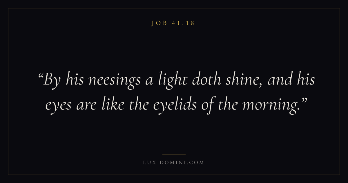 Books / Job / Chapter 41 / Verse 18 ← Job 41:17 Job 41:18 Job 41:19 → By his neesings a light doth shine, and his eyes are like the eyelids of the morning. Download verse card Share on Twitter Share on Facebook Pin it ✦ Key themes Suffering and trialsWisdomJustice and mercySuffering Read with Job 41:17Romans 8:182 Corinthians 4:17Proverbs 1:7 Related topics Bible verses about suffering and trialsBible verses about wisdomBible verses about justice and mercy ✦ Job Chapter 41 verses V. 1 V. 2 V. 3 V. 4 V. 5 V. 6 V. 7 V. 8 V. 9 V. 10 V. 11 V. 12 V. 13 V. 14 V. 15 V. 16 V. 17 V. 18 V. 19 V. 20 V. 21 V. 22 V. 23 V. 24 V. 25 V. 26 V. 27 V. 28 V. 29 V. 30 V. 31 V. 32 V. 33 V. 34
