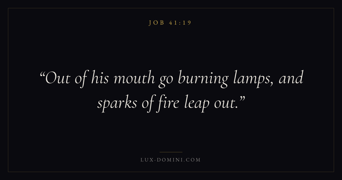 Books / Job / Chapter 41 / Verse 19 ← Job 41:18 Job 41:19 Job 41:20 → Out of his mouth go burning lamps, and sparks of fire leap out. Download verse card Share on Twitter Share on Facebook Pin it ✦ Key themes Suffering and trialsWisdomJustice and mercySuffering Read with Job 41:20Romans 8:182 Corinthians 4:17Proverbs 1:7 Related topics Bible verses about suffering and trialsBible verses about wisdomBible verses about justice and mercy ✦ Job Chapter 41 verses V. 1 V. 2 V. 3 V. 4 V. 5 V. 6 V. 7 V. 8 V. 9 V. 10 V. 11 V. 12 V. 13 V. 14 V. 15 V. 16 V. 17 V. 18 V. 19 V. 20 V. 21 V. 22 V. 23 V. 24 V. 25 V. 26 V. 27 V. 28 V. 29 V. 30 V. 31 V. 32 V. 33 V. 34