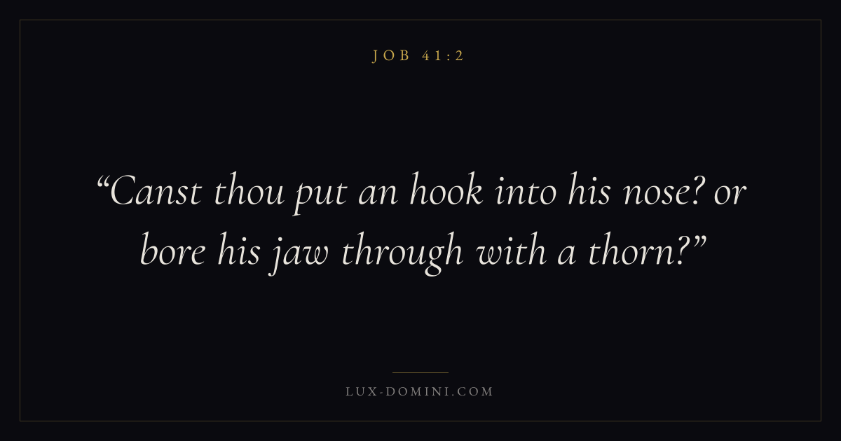 Books / Job / Chapter 41 / Verse 2 ← Job 41:1 Job 41:2 Job 41:3 → Canst thou put an hook into his nose? or bore his jaw through with a thorn? Download verse card Share on Twitter Share on Facebook Pin it ✦ Key themes Suffering and trialsWisdomJustice and mercySuffering Read with Job 41:1Romans 8:182 Corinthians 4:17Proverbs 1:7 Related topics Bible verses about suffering and trialsBible verses about wisdomBible verses about justice and mercy ✦ Job Chapter 41 verses V. 1 V. 2 V. 3 V. 4 V. 5 V. 6 V. 7 V. 8 V. 9 V. 10 V. 11 V. 12 V. 13 V. 14 V. 15 V. 16 V. 17 V. 18 V. 19 V. 20 V. 21 V. 22 V. 23 V. 24 V. 25 V. 26 V. 27 V. 28 V. 29 V. 30 V. 31 V. 32 V. 33 V. 34