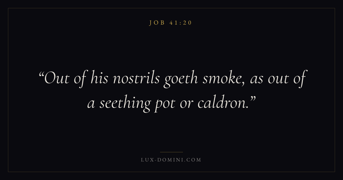 Books / Job / Chapter 41 / Verse 20 ← Job 41:19 Job 41:20 Job 41:21 → Out of his nostrils goeth smoke, as out of a seething pot or caldron. Download verse card Share on Twitter Share on Facebook Pin it ✦ Key themes Suffering and trialsWisdomJustice and mercySuffering Read with Job 41:19Romans 8:182 Corinthians 4:17Proverbs 1:7 Related topics Bible verses about suffering and trialsBible verses about wisdomBible verses about justice and mercy ✦ Job Chapter 41 verses V. 1 V. 2 V. 3 V. 4 V. 5 V. 6 V. 7 V. 8 V. 9 V. 10 V. 11 V. 12 V. 13 V. 14 V. 15 V. 16 V. 17 V. 18 V. 19 V. 20 V. 21 V. 22 V. 23 V. 24 V. 25 V. 26 V. 27 V. 28 V. 29 V. 30 V. 31 V. 32 V. 33 V. 34