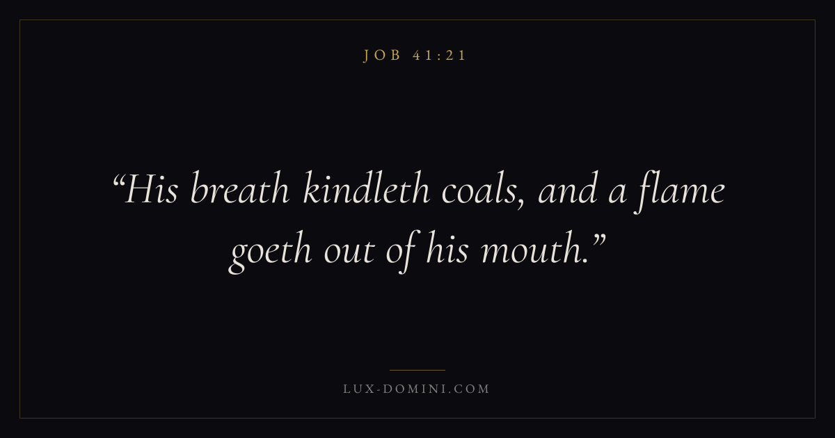 Books / Job / Chapter 41 / Verse 21 ← Job 41:20 Job 41:21 Job 41:22 → His breath kindleth coals, and a flame goeth out of his mouth. Download verse card Share on Twitter Share on Facebook Pin it ✦ Key themes Suffering and trialsWisdomJustice and mercySuffering Read with Job 41:22Romans 8:182 Corinthians 4:17Proverbs 1:7 Related topics Bible verses about suffering and trialsBible verses about wisdomBible verses about justice and mercy ✦ Job Chapter 41 verses V. 1 V. 2 V. 3 V. 4 V. 5 V. 6 V. 7 V. 8 V. 9 V. 10 V. 11 V. 12 V. 13 V. 14 V. 15 V. 16 V. 17 V. 18 V. 19 V. 20 V. 21 V. 22 V. 23 V. 24 V. 25 V. 26 V. 27 V. 28 V. 29 V. 30 V. 31 V. 32 V. 33 V. 34