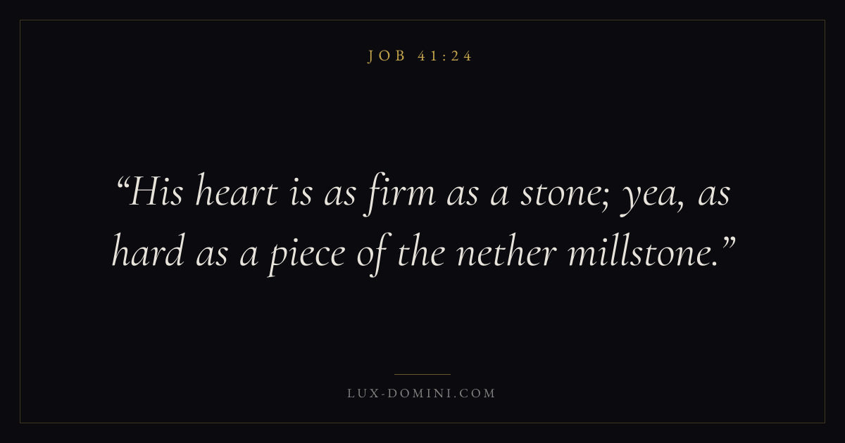 Books / Job / Chapter 41 / Verse 24 ← Job 41:23 Job 41:24 Job 41:25 → His heart is as firm as a stone; yea, as hard as a piece of the nether millstone. Download verse card Share on Twitter Share on Facebook Pin it ✦ Key themes Suffering and trialsWisdomJustice and mercySuffering Read with Job 41:23Romans 8:182 Corinthians 4:17Proverbs 1:7 Related topics Bible verses about suffering and trialsBible verses about wisdomBible verses about justice and mercy ✦ Job Chapter 41 verses V. 1 V. 2 V. 3 V. 4 V. 5 V. 6 V. 7 V. 8 V. 9 V. 10 V. 11 V. 12 V. 13 V. 14 V. 15 V. 16 V. 17 V. 18 V. 19 V. 20 V. 21 V. 22 V. 23 V. 24 V. 25 V. 26 V. 27 V. 28 V. 29 V. 30 V. 31 V. 32 V. 33 V. 34