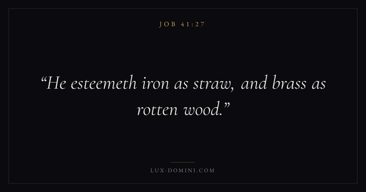 Books / Job / Chapter 41 / Verse 27 ← Job 41:26 Job 41:27 Job 41:28 → He esteemeth iron as straw, and brass as rotten wood. Download verse card Share on Twitter Share on Facebook Pin it ✦ Key themes Suffering and trialsWisdomJustice and mercySuffering Read with Job 41:28Romans 8:182 Corinthians 4:17Proverbs 1:7 Related topics Bible verses about suffering and trialsBible verses about wisdomBible verses about justice and mercy ✦ Job Chapter 41 verses V. 1 V. 2 V. 3 V. 4 V. 5 V. 6 V. 7 V. 8 V. 9 V. 10 V. 11 V. 12 V. 13 V. 14 V. 15 V. 16 V. 17 V. 18 V. 19 V. 20 V. 21 V. 22 V. 23 V. 24 V. 25 V. 26 V. 27 V. 28 V. 29 V. 30 V. 31 V. 32 V. 33 V. 34