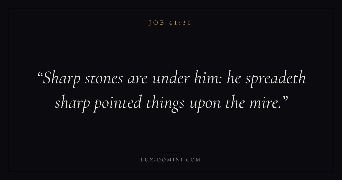 Books / Job / Chapter 41 / Verse 30 ← Job 41:29 Job 41:30 Job 41:31 → Sharp stones are under him: he spreadeth sharp pointed things upon the mire. Download verse card Share on Twitter Share on Facebook Pin it ✦ Key themes Suffering and trialsWisdomJustice and mercySuffering Read with Job 41:29Romans 8:182 Corinthians 4:17Proverbs 1:7 Related topics Bible verses about suffering and trialsBible verses about wisdomBible verses about justice and mercy ✦ Job Chapter 41 verses V. 1 V. 2 V. 3 V. 4 V. 5 V. 6 V. 7 V. 8 V. 9 V. 10 V. 11 V. 12 V. 13 V. 14 V. 15 V. 16 V. 17 V. 18 V. 19 V. 20 V. 21 V. 22 V. 23 V. 24 V. 25 V. 26 V. 27 V. 28 V. 29 V. 30 V. 31 V. 32 V. 33 V. 34