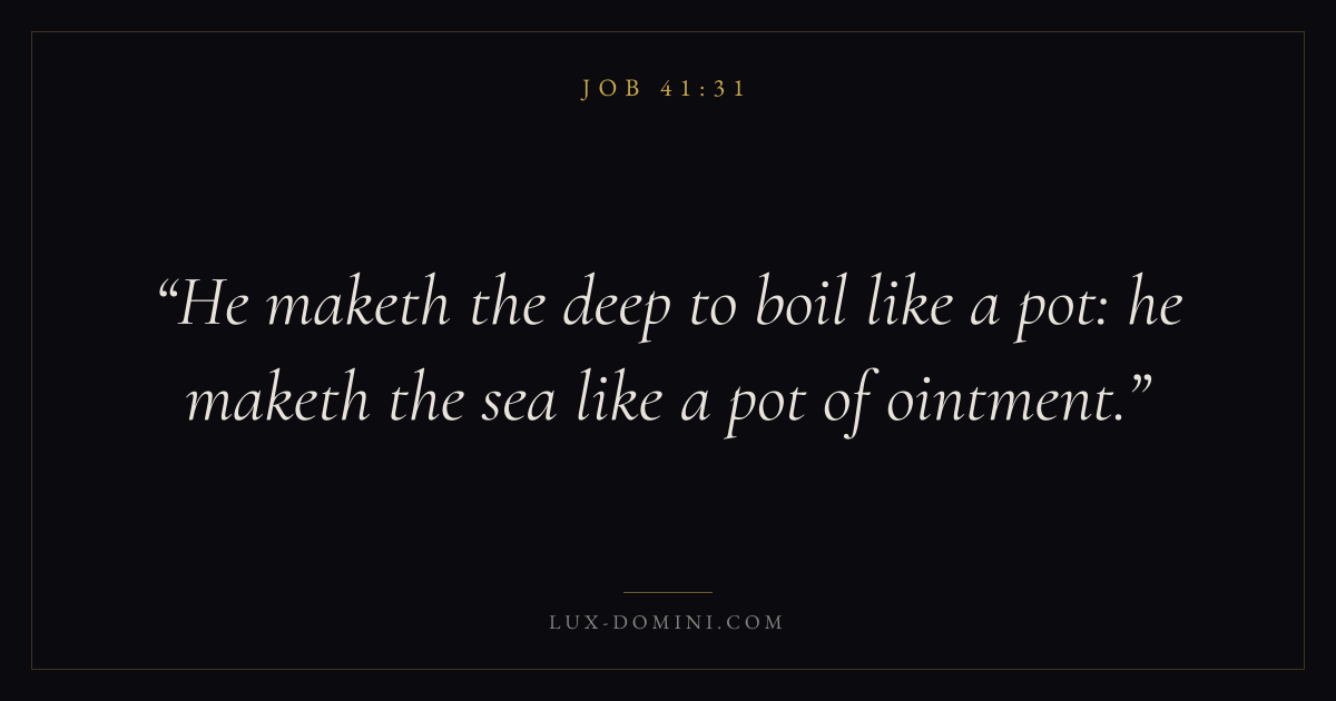Books / Job / Chapter 41 / Verse 31 ← Job 41:30 Job 41:31 Job 41:32 → He maketh the deep to boil like a pot: he maketh the sea like a pot of ointment. Download verse card Share on Twitter Share on Facebook Pin it ✦ Key themes Suffering and trialsWisdomJustice and mercySuffering Read with Job 41:32Romans 8:182 Corinthians 4:17Proverbs 1:7 Related topics Bible verses about suffering and trialsBible verses about wisdomBible verses about justice and mercy ✦ Job Chapter 41 verses V. 1 V. 2 V. 3 V. 4 V. 5 V. 6 V. 7 V. 8 V. 9 V. 10 V. 11 V. 12 V. 13 V. 14 V. 15 V. 16 V. 17 V. 18 V. 19 V. 20 V. 21 V. 22 V. 23 V. 24 V. 25 V. 26 V. 27 V. 28 V. 29 V. 30 V. 31 V. 32 V. 33 V. 34
