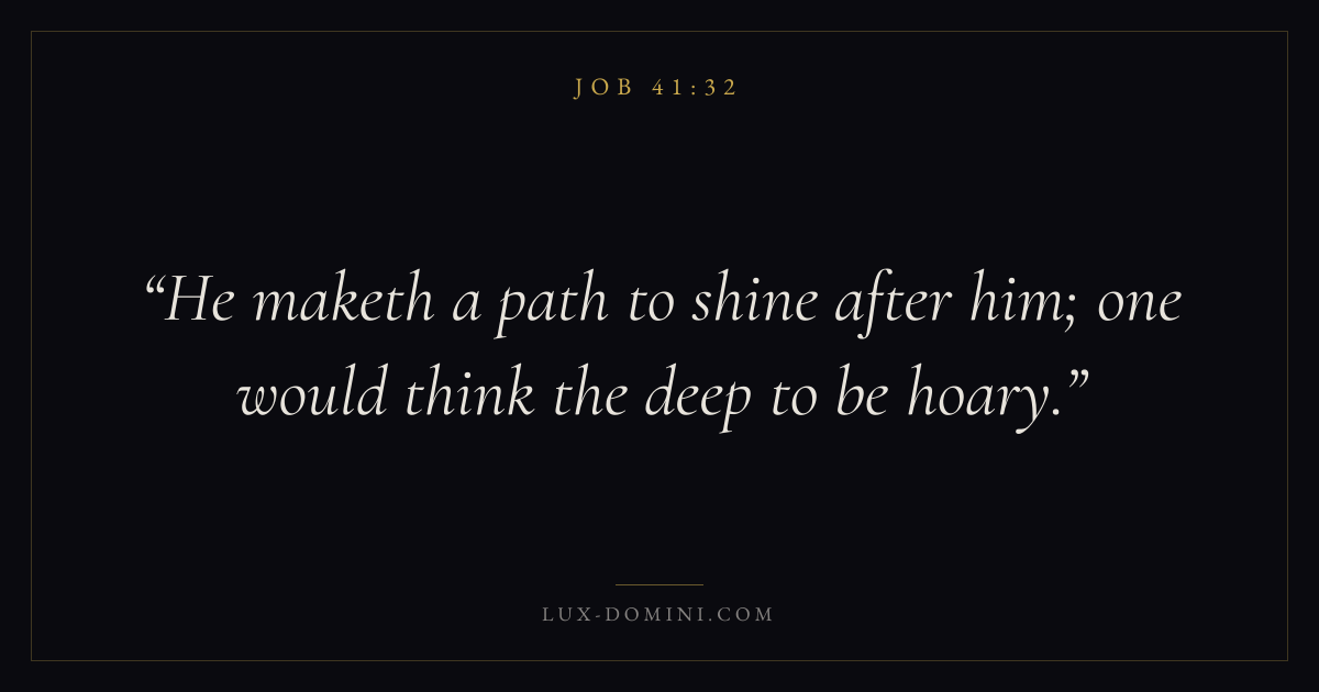 Books / Job / Chapter 41 / Verse 32 ← Job 41:31 Job 41:32 Job 41:33 → He maketh a path to shine after him; one would think the deep to be hoary. Download verse card Share on Twitter Share on Facebook Pin it ✦ Key themes Suffering and trialsWisdomJustice and mercySuffering Read with Job 41:31Romans 8:182 Corinthians 4:17Proverbs 1:7 Related topics Bible verses about suffering and trialsBible verses about wisdomBible verses about justice and mercy ✦ Job Chapter 41 verses V. 1 V. 2 V. 3 V. 4 V. 5 V. 6 V. 7 V. 8 V. 9 V. 10 V. 11 V. 12 V. 13 V. 14 V. 15 V. 16 V. 17 V. 18 V. 19 V. 20 V. 21 V. 22 V. 23 V. 24 V. 25 V. 26 V. 27 V. 28 V. 29 V. 30 V. 31 V. 32 V. 33 V. 34
