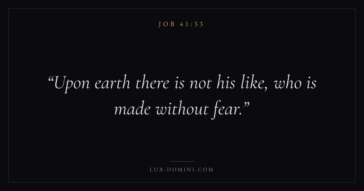 Books / Job / Chapter 41 / Verse 33 ← Job 41:32 Job 41:33 Job 41:34 → Upon earth there is not his like, who is made without fear. Download verse card Share on Twitter Share on Facebook Pin it ✦ Key themes Anxiety and fearSuffering and trialsWisdomJustice and mercySuffering Read with Job 41:34Philippians 4:6Isaiah 41:10Romans 8:18 Related topics Bible verses about anxiety and fearBible verses about suffering and trialsBible verses about wisdomBible verses about justice and mercy ✦ Job Chapter 41 verses V. 1 V. 2 V. 3 V. 4 V. 5 V. 6 V. 7 V. 8 V. 9 V. 10 V. 11 V. 12 V. 13 V. 14 V. 15 V. 16 V. 17 V. 18 V. 19 V. 20 V. 21 V. 22 V. 23 V. 24 V. 25 V. 26 V. 27 V. 28 V. 29 V. 30 V. 31 V. 32 V. 33 V. 34