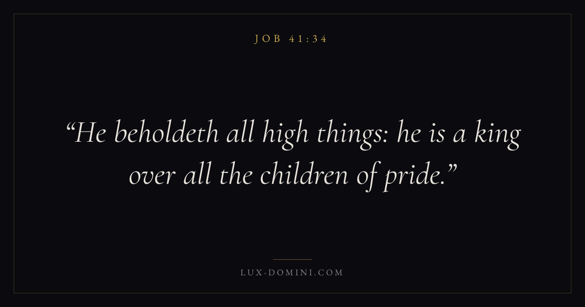 Books / Job / Chapter 41 / Verse 34 ← Job 41:33 Job 41:34 Job 42:1 → He beholdeth all high things: he is a king over all the children of pride. Download verse card Share on Twitter Share on Facebook Pin it ✦ Key themes Suffering and trialsWisdomJustice and mercyHumilitySuffering Read with Job 41:33Romans 8:182 Corinthians 4:17Proverbs 1:7 Related topics Bible verses about suffering and trialsBible verses about wisdomBible verses about justice and mercyBible verses about humility ✦ Job Chapter 41 verses V. 1 V. 2 V. 3 V. 4 V. 5 V. 6 V. 7 V. 8 V. 9 V. 10 V. 11 V. 12 V. 13 V. 14 V. 15 V. 16 V. 17 V. 18 V. 19 V. 20 V. 21 V. 22 V. 23 V. 24 V. 25 V. 26 V. 27 V. 28 V. 29 V. 30 V. 31 V. 32 V. 33 V. 34