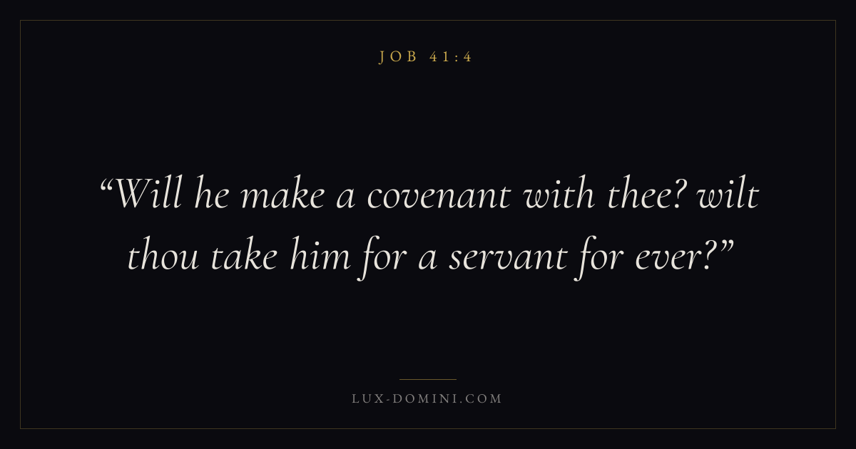 Books / Job / Chapter 41 / Verse 4 ← Job 41:3 Job 41:4 Job 41:5 → Will he make a covenant with thee? wilt thou take him for a servant for ever? Download verse card Share on Twitter Share on Facebook Pin it ✦ Key themes Suffering and trialsWisdomJustice and mercySuffering Read with Job 41:3Romans 8:182 Corinthians 4:17Proverbs 1:7 Related topics Bible verses about suffering and trialsBible verses about wisdomBible verses about justice and mercy ✦ Job Chapter 41 verses V. 1 V. 2 V. 3 V. 4 V. 5 V. 6 V. 7 V. 8 V. 9 V. 10 V. 11 V. 12 V. 13 V. 14 V. 15 V. 16 V. 17 V. 18 V. 19 V. 20 V. 21 V. 22 V. 23 V. 24 V. 25 V. 26 V. 27 V. 28 V. 29 V. 30 V. 31 V. 32 V. 33 V. 34
