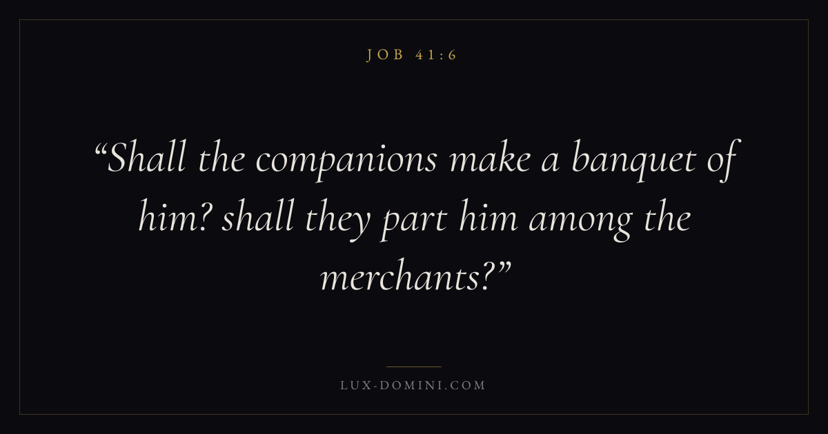 Books / Job / Chapter 41 / Verse 6 ← Job 41:5 Job 41:6 Job 41:7 → Shall the companions make a banquet of him? shall they part him among the merchants? Download verse card Share on Twitter Share on Facebook Pin it ✦ Key themes Suffering and trialsWisdomJustice and mercySuffering Read with Job 41:5Romans 8:182 Corinthians 4:17Proverbs 1:7 Related topics Bible verses about suffering and trialsBible verses about wisdomBible verses about justice and mercy ✦ Job Chapter 41 verses V. 1 V. 2 V. 3 V. 4 V. 5 V. 6 V. 7 V. 8 V. 9 V. 10 V. 11 V. 12 V. 13 V. 14 V. 15 V. 16 V. 17 V. 18 V. 19 V. 20 V. 21 V. 22 V. 23 V. 24 V. 25 V. 26 V. 27 V. 28 V. 29 V. 30 V. 31 V. 32 V. 33 V. 34