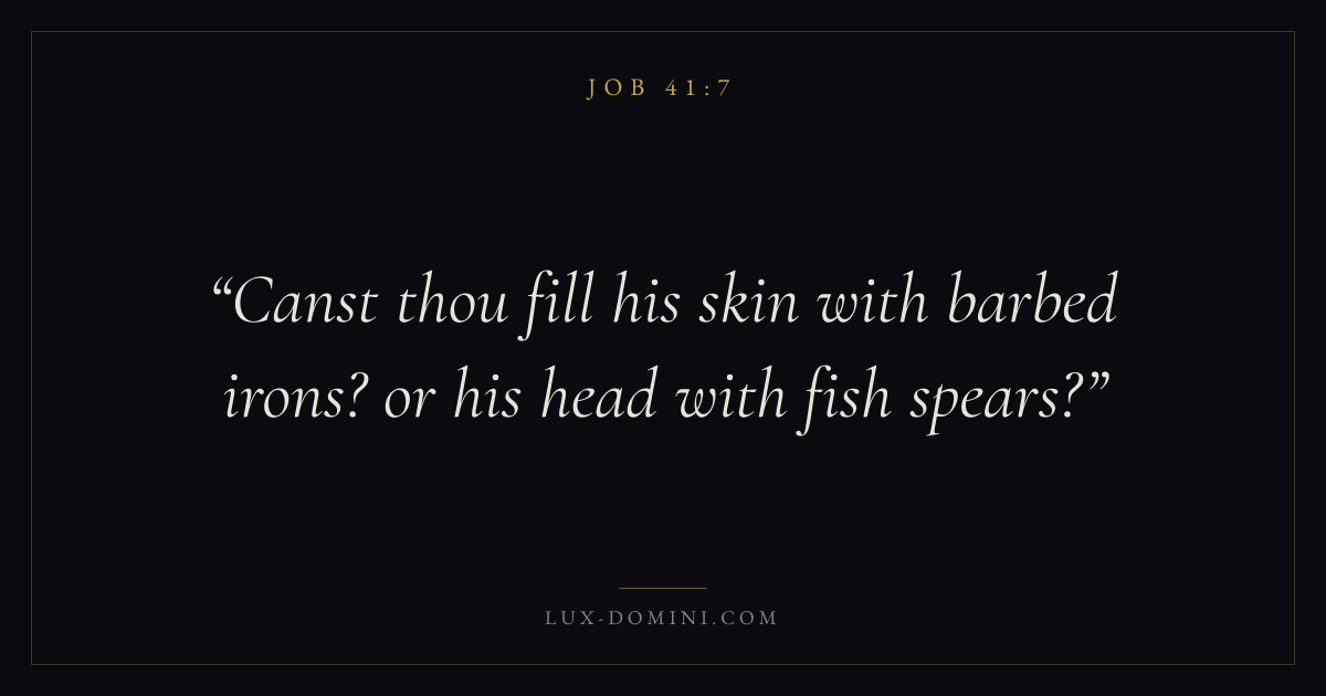 Books / Job / Chapter 41 / Verse 7 ← Job 41:6 Job 41:7 Job 41:8 → Canst thou fill his skin with barbed irons? or his head with fish spears? Download verse card Share on Twitter Share on Facebook Pin it ✦ Key themes Suffering and trialsWisdomJustice and mercySuffering Read with Job 41:8Romans 8:182 Corinthians 4:17Proverbs 1:7 Related topics Bible verses about suffering and trialsBible verses about wisdomBible verses about justice and mercy ✦ Job Chapter 41 verses V. 1 V. 2 V. 3 V. 4 V. 5 V. 6 V. 7 V. 8 V. 9 V. 10 V. 11 V. 12 V. 13 V. 14 V. 15 V. 16 V. 17 V. 18 V. 19 V. 20 V. 21 V. 22 V. 23 V. 24 V. 25 V. 26 V. 27 V. 28 V. 29 V. 30 V. 31 V. 32 V. 33 V. 34