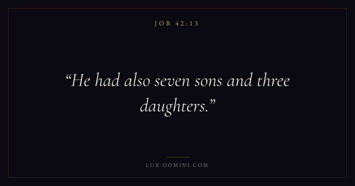 Books / Job / Chapter 42 / Verse 13 ← Job 42:12 Job 42:13 Job 42:14 → He had also seven sons and three daughters. Download verse card Share on Twitter Share on Facebook Pin it ✦ Key themes Suffering and trialsWisdomJustice and mercySuffering Read with Job 42:14Job 42:15Romans 8:182 Corinthians 4:17 Related topics Bible verses about suffering and trialsBible verses about wisdomBible verses about justice and mercy ✦ Job Chapter 42 verses V. 1 V. 2 V. 3 V. 4 V. 5 V. 6 V. 7 V. 8 V. 9 V. 10 V. 11 V. 12 V. 13 V. 14 V. 15 V. 16 V. 17