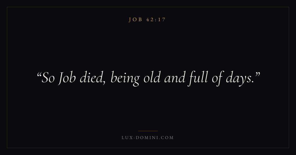 Books / Job / Chapter 42 / Verse 17 ← Job 42:16 Job 42:17 Psalms 1:1 → So Job died, being old and full of days. Download verse card Share on Twitter Share on Facebook Pin it ✦ Key themes Suffering and trialsWisdomJustice and mercySuffering Read with Job 42:16Romans 8:182 Corinthians 4:17Proverbs 1:7 Related topics Bible verses about suffering and trialsBible verses about wisdomBible verses about justice and mercy ✦ Job Chapter 42 verses V. 1 V. 2 V. 3 V. 4 V. 5 V. 6 V. 7 V. 8 V. 9 V. 10 V. 11 V. 12 V. 13 V. 14 V. 15 V. 16 V. 17