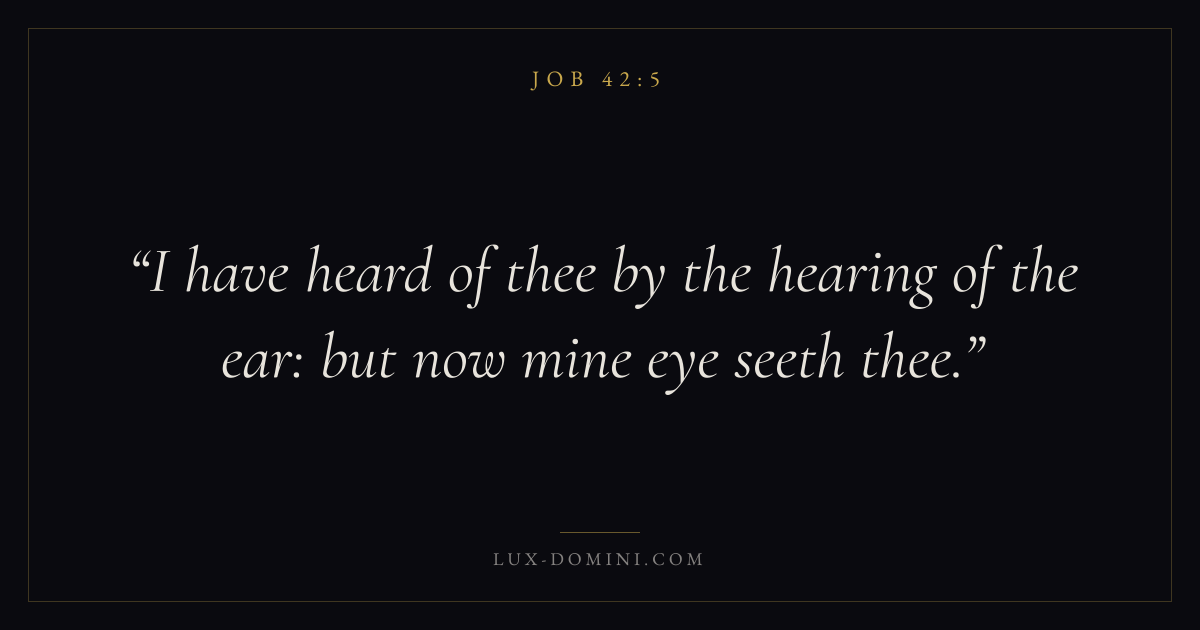 Books / Job / Chapter 42 / Verse 5 ← Job 42:4 Job 42:5 Job 42:6 → I have heard of thee by the hearing of the ear: but now mine eye seeth thee. Download verse card Share on Twitter Share on Facebook Pin it ✦ Key themes Suffering and trialsWisdomJustice and mercySuffering Read with Job 42:6Romans 8:182 Corinthians 4:17Proverbs 1:7 Related topics Bible verses about suffering and trialsBible verses about wisdomBible verses about justice and mercy ✦ Job Chapter 42 verses V. 1 V. 2 V. 3 V. 4 V. 5 V. 6 V. 7 V. 8 V. 9 V. 10 V. 11 V. 12 V. 13 V. 14 V. 15 V. 16 V. 17