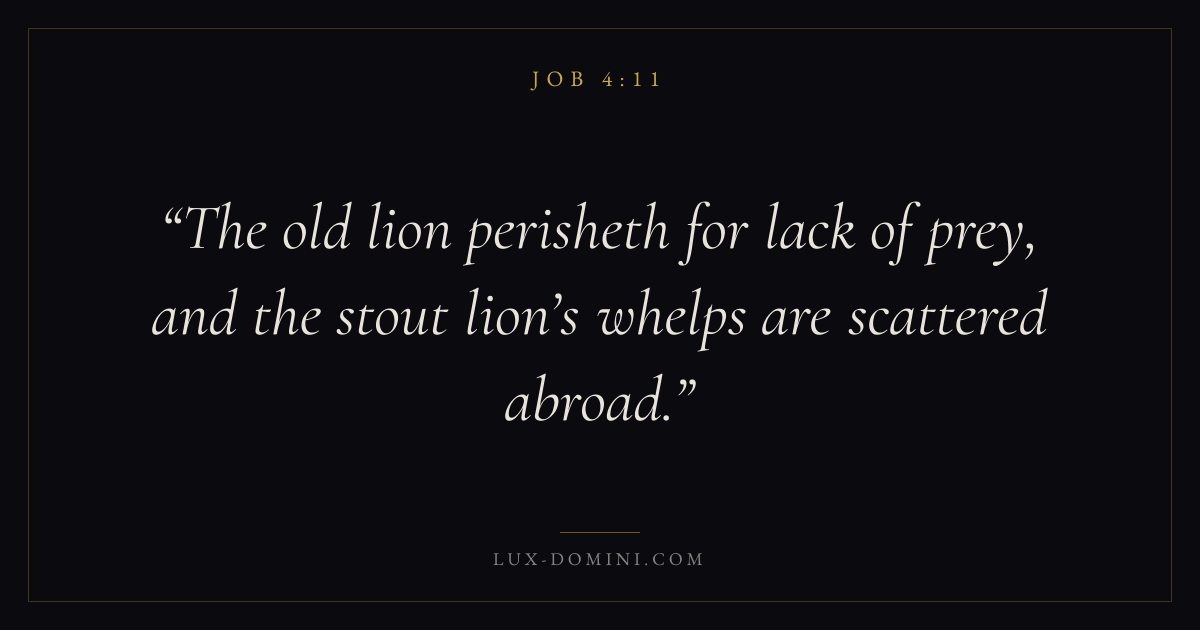 The old lion perisheth for lack of prey, and the stout lion’s whelps are scattered abroad.