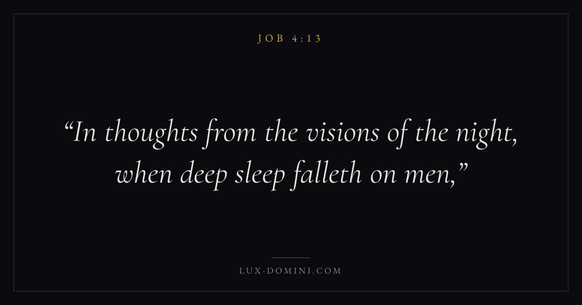 Books / Job / Chapter 4 / Verse 13 ← Job 4:12 Job 4:13 Job 4:14 → In thoughts from the visions of the night, when deep sleep falleth on men, Download verse card Share on Twitter Share on Facebook Pin it ✦ Key themes Suffering and trialsWisdomJustice and mercyPeaceSuffering Read with Job 4:14Job 4:15Romans 8:182 Corinthians 4:17 Related topics Bible verses about suffering and trialsBible verses about wisdomBible verses about justice and mercyBible verses about peace ✦ Job Chapter 4 verses V. 1 V. 2 V. 3 V. 4 V. 5 V. 6 V. 7 V. 8 V. 9 V. 10 V. 11 V. 12 V. 13 V. 14 V. 15 V. 16 V. 17 V. 18 V. 19 V. 20 V. 21