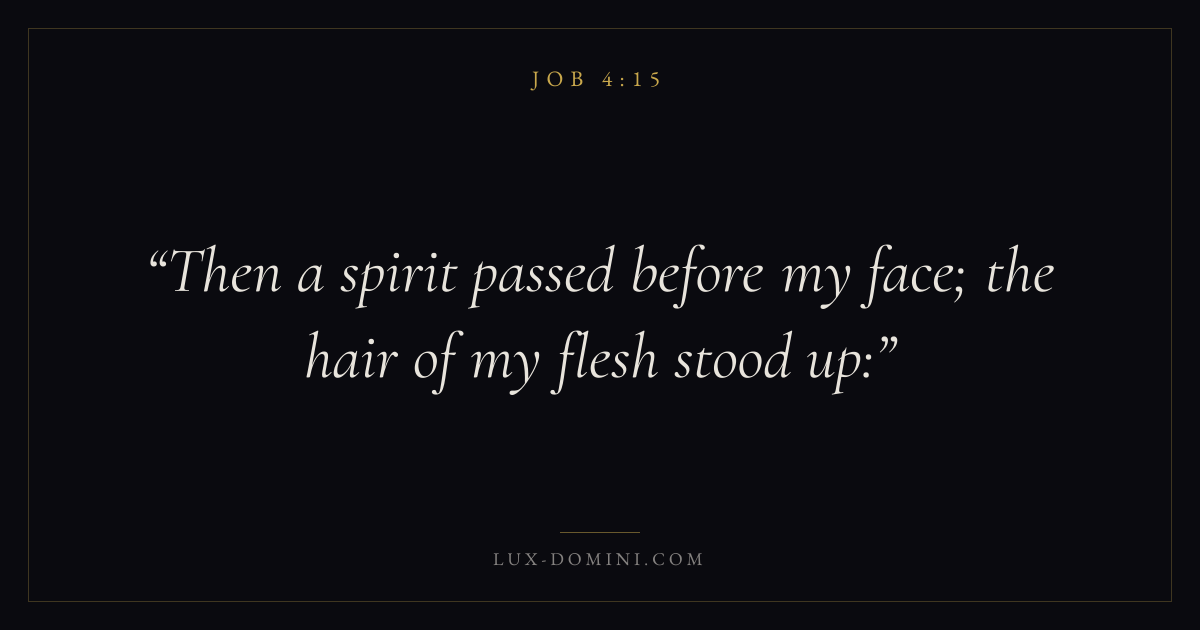 Books / Job / Chapter 4 / Verse 15 ← Job 4:14 Job 4:15 Job 4:16 → Then a spirit passed before my face; the hair of my flesh stood up: Download verse card Share on Twitter Share on Facebook Pin it ✦ Key themes Suffering and trialsWisdomJustice and mercyPeaceSuffering Read with Job 4:13Job 4:14Romans 8:182 Corinthians 4:17 Related topics Bible verses about suffering and trialsBible verses about wisdomBible verses about justice and mercyBible verses about peace ✦ Job Chapter 4 verses V. 1 V. 2 V. 3 V. 4 V. 5 V. 6 V. 7 V. 8 V. 9 V. 10 V. 11 V. 12 V. 13 V. 14 V. 15 V. 16 V. 17 V. 18 V. 19 V. 20 V. 21