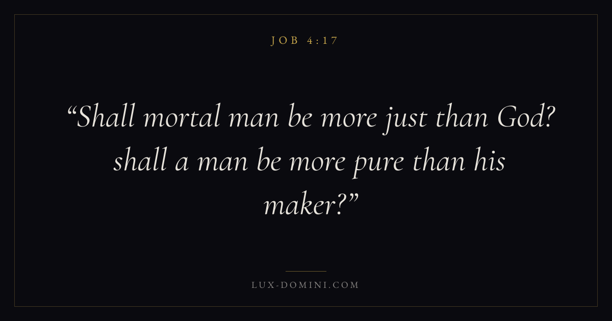 Books / Job / Chapter 4 / Verse 17 ← Job 4:16 Job 4:17 Job 4:18 → Shall mortal man be more just than God? shall a man be more pure than his maker? Download verse card Share on Twitter Share on Facebook Pin it ✦ Key themes Suffering and trialsWisdomJustice and mercyPeaceSuffering Read with Job 4:13Job 4:14Romans 8:182 Corinthians 4:17 Related topics Bible verses about suffering and trialsBible verses about wisdomBible verses about justice and mercyBible verses about peace ✦ Job Chapter 4 verses V. 1 V. 2 V. 3 V. 4 V. 5 V. 6 V. 7 V. 8 V. 9 V. 10 V. 11 V. 12 V. 13 V. 14 V. 15 V. 16 V. 17 V. 18 V. 19 V. 20 V. 21