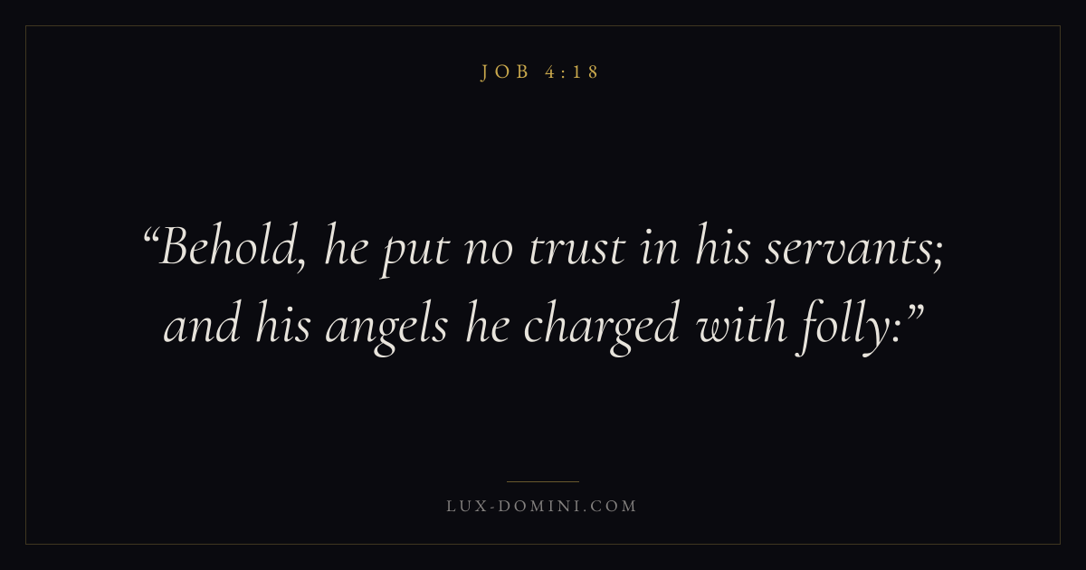 Books / Job / Chapter 4 / Verse 18 ← Job 4:17 Job 4:18 Job 4:19 → Behold, he put no trust in his servants; and his angels he charged with folly: Download verse card Share on Twitter Share on Facebook Pin it ✦ Key themes FaithSuffering and trialsWisdomJustice and mercySuffering Read with Job 4:19Hebrews 11:1Romans 10:17Romans 8:18 Related topics Bible verses about faithBible verses about suffering and trialsBible verses about wisdomBible verses about justice and mercy ✦ Job Chapter 4 verses V. 1 V. 2 V. 3 V. 4 V. 5 V. 6 V. 7 V. 8 V. 9 V. 10 V. 11 V. 12 V. 13 V. 14 V. 15 V. 16 V. 17 V. 18 V. 19 V. 20 V. 21