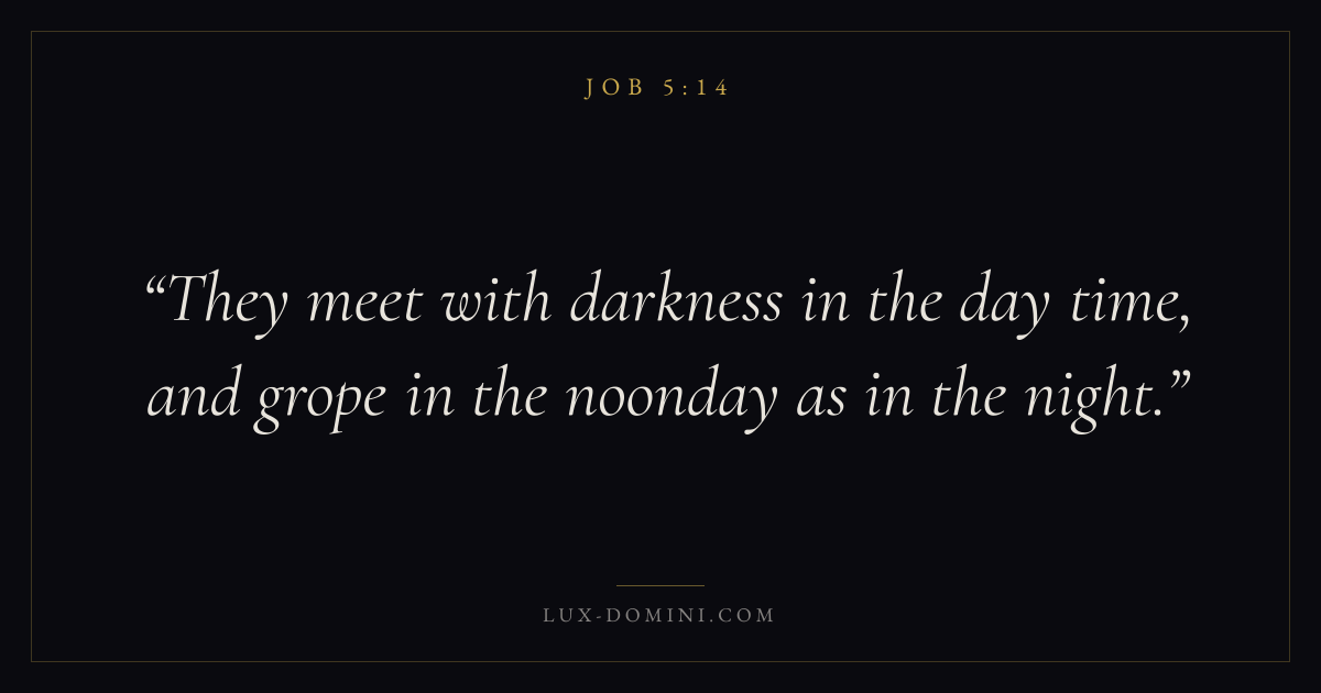 Books / Job / Chapter 5 / Verse 14 ← Job 5:13 Job 5:14 Job 5:15 → They meet with darkness in the day time, and grope in the noonday as in the night. Download verse card Share on Twitter Share on Facebook Pin it ✦ Key themes Suffering and trialsWisdomJustice and mercySuffering Read with Job 5:15Job 5:16Romans 8:182 Corinthians 4:17 Related topics Bible verses about suffering and trialsBible verses about wisdomBible verses about justice and mercy ✦ Job Chapter 5 verses V. 1 V. 2 V. 3 V. 4 V. 5 V. 6 V. 7 V. 8 V. 9 V. 10 V. 11 V. 12 V. 13 V. 14 V. 15 V. 16 V. 17 V. 18 V. 19 V. 20 V. 21 V. 22 V. 23 V. 24 V. 25 V. 26 V. 27