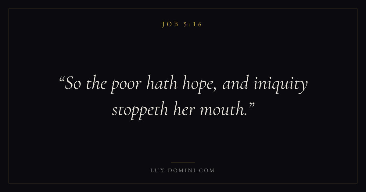 Books / Job / Chapter 5 / Verse 16 ← Job 5:15 Job 5:16 Job 5:17 → So the poor hath hope, and iniquity stoppeth her mouth. Download verse card Share on Twitter Share on Facebook Pin it ✦ Key themes HopeSuffering and trialsWisdomJustice and mercySuffering Read with Job 5:14Job 5:15Romans 8:24Revelation 21:4 Related topics Bible verses about hopeBible verses about suffering and trialsBible verses about wisdomBible verses about justice and mercy ✦ Job Chapter 5 verses V. 1 V. 2 V. 3 V. 4 V. 5 V. 6 V. 7 V. 8 V. 9 V. 10 V. 11 V. 12 V. 13 V. 14 V. 15 V. 16 V. 17 V. 18 V. 19 V. 20 V. 21 V. 22 V. 23 V. 24 V. 25 V. 26 V. 27