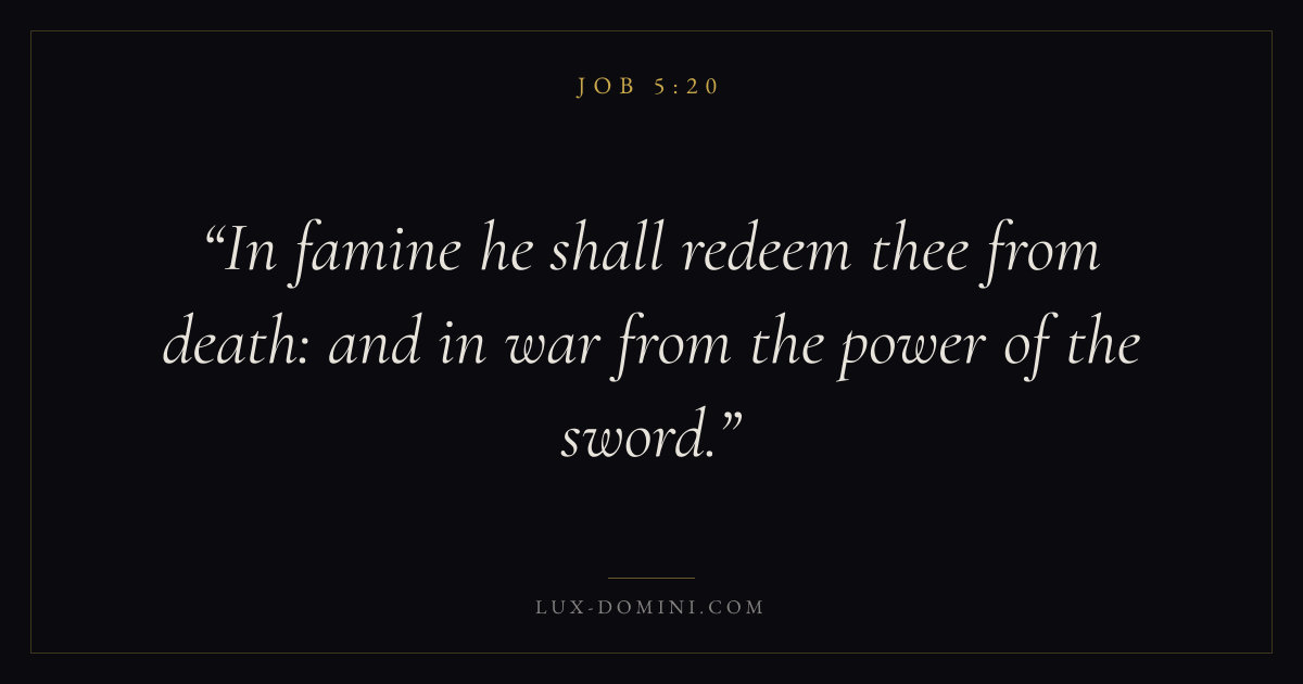 Books / Job / Chapter 5 / Verse 20 ← Job 5:19 Job 5:20 Job 5:21 → In famine he shall redeem thee from death: and in war from the power of the sword. Download verse card Share on Twitter Share on Facebook Pin it ✦ Key themes LoveSuffering and trialsWisdomJustice and mercySuffering Read with Job 5:19Job 5:21John 3:161 Corinthians 13:4 Related topics Bible verses about loveBible verses about suffering and trialsBible verses about wisdomBible verses about justice and mercy ✦ Job Chapter 5 verses V. 1 V. 2 V. 3 V. 4 V. 5 V. 6 V. 7 V. 8 V. 9 V. 10 V. 11 V. 12 V. 13 V. 14 V. 15 V. 16 V. 17 V. 18 V. 19 V. 20 V. 21 V. 22 V. 23 V. 24 V. 25 V. 26 V. 27
