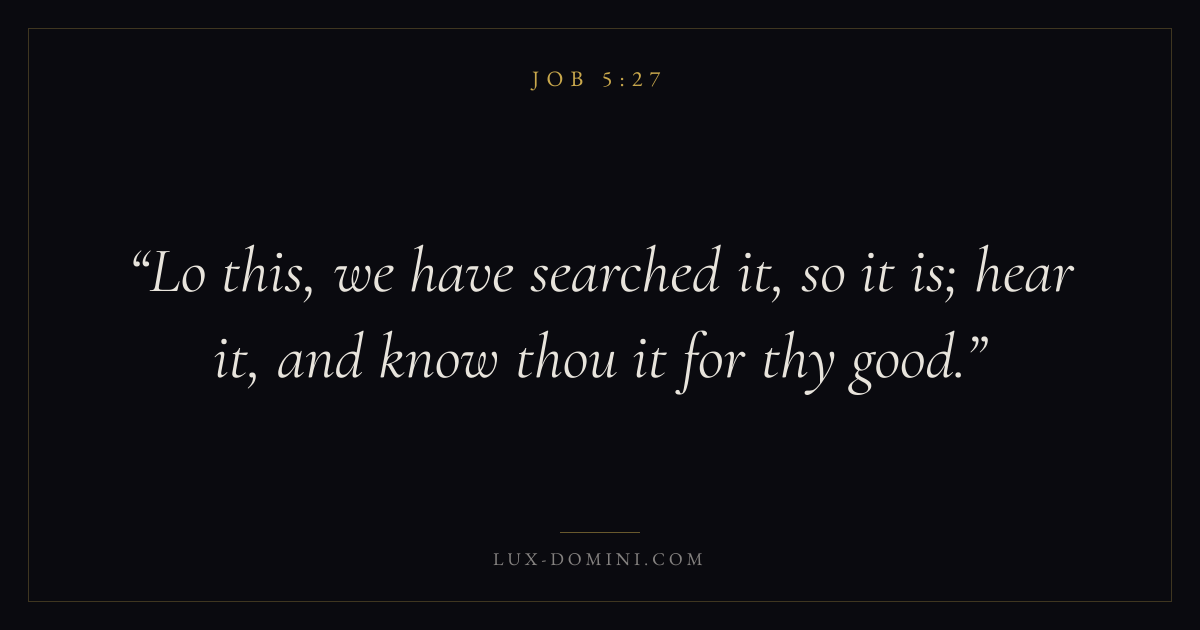 Books / Job / Chapter 5 / Verse 27 ← Job 5:26 Job 5:27 Job 6:1 → Lo this, we have searched it, so it is; hear it, and know thou it for thy good. Download verse card Share on Twitter Share on Facebook Pin it ✦ Key themes LoveSuffering and trialsWisdomJustice and mercySuffering Read with Job 5:25Job 5:26John 3:161 Corinthians 13:4 Related topics Bible verses about loveBible verses about suffering and trialsBible verses about wisdomBible verses about justice and mercy ✦ Job Chapter 5 verses V. 1 V. 2 V. 3 V. 4 V. 5 V. 6 V. 7 V. 8 V. 9 V. 10 V. 11 V. 12 V. 13 V. 14 V. 15 V. 16 V. 17 V. 18 V. 19 V. 20 V. 21 V. 22 V. 23 V. 24 V. 25 V. 26 V. 27
