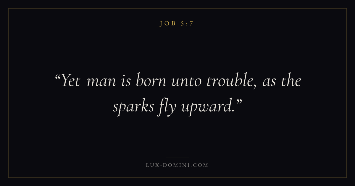 Books / Job / Chapter 5 / Verse 7 ← Job 5:6 Job 5:7 Job 5:8 → Yet man is born unto trouble, as the sparks fly upward. Download verse card Share on Twitter Share on Facebook Pin it ✦ Key themes Suffering and trialsWisdomJustice and mercySuffering Read with Job 5:6Romans 8:182 Corinthians 4:17Proverbs 1:7 Related topics Bible verses about suffering and trialsBible verses about wisdomBible verses about justice and mercy ✦ Job Chapter 5 verses V. 1 V. 2 V. 3 V. 4 V. 5 V. 6 V. 7 V. 8 V. 9 V. 10 V. 11 V. 12 V. 13 V. 14 V. 15 V. 16 V. 17 V. 18 V. 19 V. 20 V. 21 V. 22 V. 23 V. 24 V. 25 V. 26 V. 27