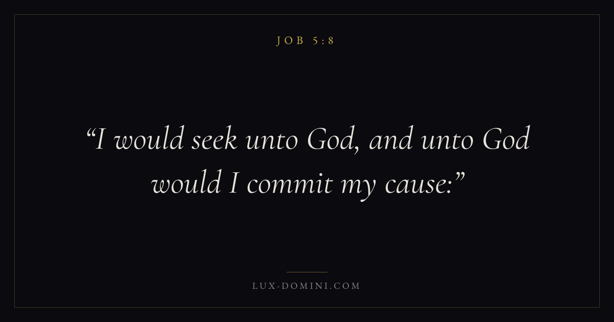 Books / Job / Chapter 5 / Verse 8 ← Job 5:7 Job 5:8 Job 5:9 → I would seek unto God, and unto God would I commit my cause: Download verse card Share on Twitter Share on Facebook Pin it ✦ Key themes Suffering and trialsWisdomJustice and mercySuffering Read with Job 5:9Job 5:10Romans 8:182 Corinthians 4:17 Related topics Bible verses about suffering and trialsBible verses about wisdomBible verses about justice and mercy ✦ Job Chapter 5 verses V. 1 V. 2 V. 3 V. 4 V. 5 V. 6 V. 7 V. 8 V. 9 V. 10 V. 11 V. 12 V. 13 V. 14 V. 15 V. 16 V. 17 V. 18 V. 19 V. 20 V. 21 V. 22 V. 23 V. 24 V. 25 V. 26 V. 27