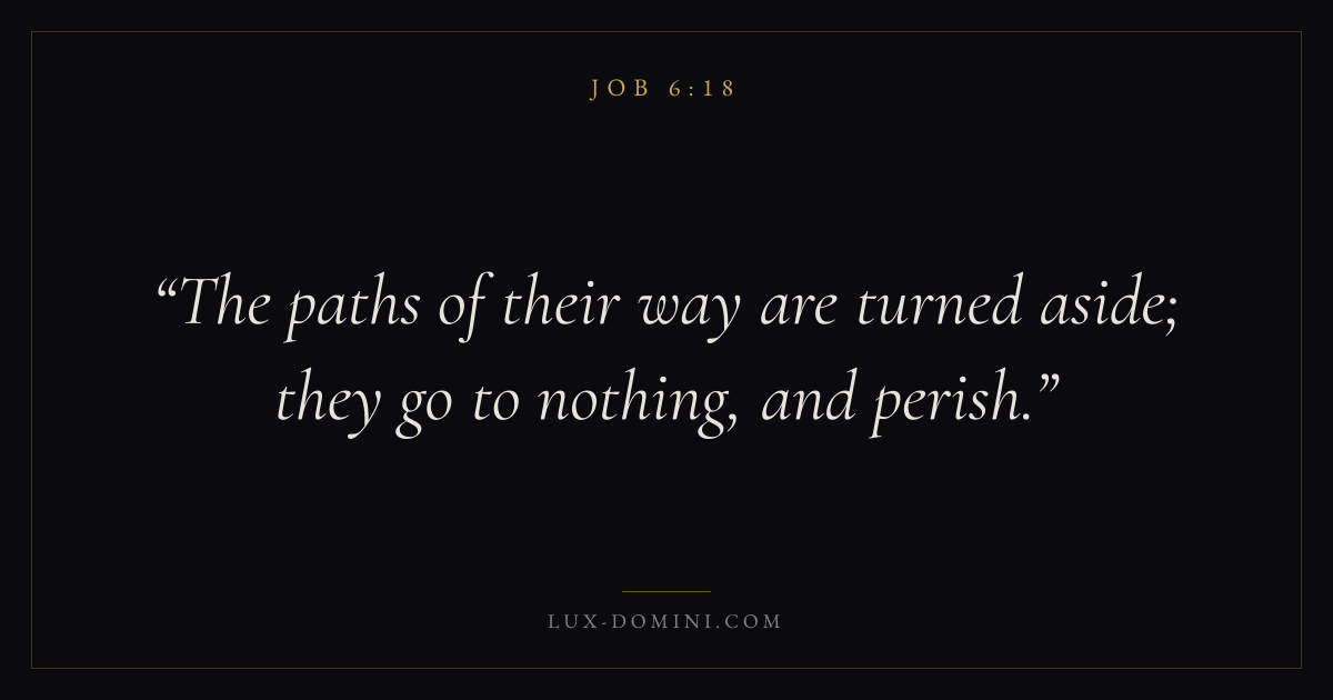Books / Job / Chapter 6 / Verse 18 ← Job 6:17 Job 6:18 Job 6:19 → The paths of their way are turned aside; they go to nothing, and perish. Download verse card Share on Twitter Share on Facebook Pin it ✦ Key themes Suffering and trialsWisdomJustice and mercySuffering Read with Job 6:19Romans 8:182 Corinthians 4:17Proverbs 1:7 Related topics Bible verses about suffering and trialsBible verses about wisdomBible verses about justice and mercy ✦ Job Chapter 6 verses V. 1 V. 2 V. 3 V. 4 V. 5 V. 6 V. 7 V. 8 V. 9 V. 10 V. 11 V. 12 V. 13 V. 14 V. 15 V. 16 V. 17 V. 18 V. 19 V. 20 V. 21 V. 22 V. 23 V. 24 V. 25 V. 26 V. 27 V. 28 V. 29 V. 30