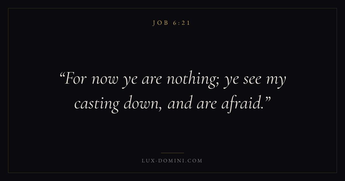 Books / Job / Chapter 6 / Verse 21 ← Job 6:20 Job 6:21 Job 6:22 → For now ye are nothing; ye see my casting down, and are afraid. Download verse card Share on Twitter Share on Facebook Pin it ✦ Key themes Anxiety and fearSuffering and trialsWisdomJustice and mercySuffering Read with Job 6:20Philippians 4:6Isaiah 41:10Romans 8:18 Related topics Bible verses about anxiety and fearBible verses about suffering and trialsBible verses about wisdomBible verses about justice and mercy ✦ Job Chapter 6 verses V. 1 V. 2 V. 3 V. 4 V. 5 V. 6 V. 7 V. 8 V. 9 V. 10 V. 11 V. 12 V. 13 V. 14 V. 15 V. 16 V. 17 V. 18 V. 19 V. 20 V. 21 V. 22 V. 23 V. 24 V. 25 V. 26 V. 27 V. 28 V. 29 V. 30