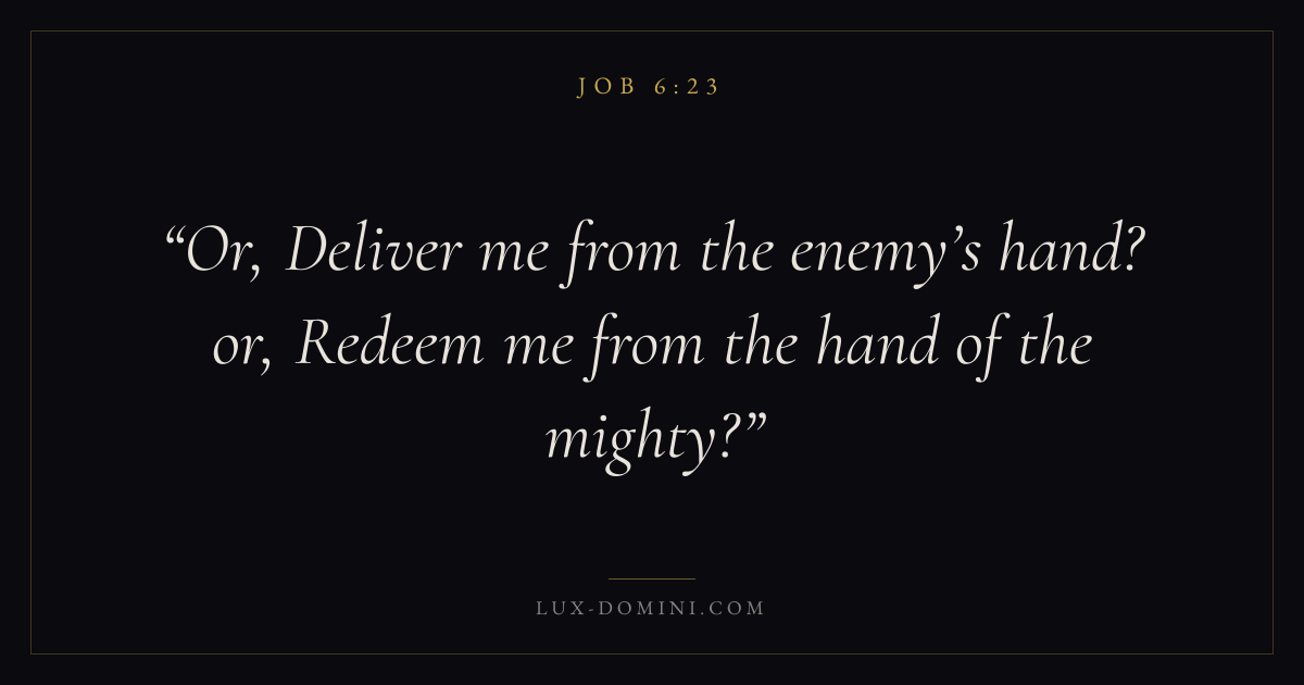 Books / Job / Chapter 6 / Verse 23 ← Job 6:22 Job 6:23 Job 6:24 → Or, Deliver me from the enemy’s hand? or, Redeem me from the hand of the mighty? Download verse card Share on Twitter Share on Facebook Pin it ✦ Key themes Suffering and trialsWisdomJustice and mercySalvationSuffering Read with Job 6:22Romans 8:182 Corinthians 4:17Proverbs 1:7 Related topics Bible verses about suffering and trialsBible verses about wisdomBible verses about justice and mercyBible verses about salvation ✦ Job Chapter 6 verses V. 1 V. 2 V. 3 V. 4 V. 5 V. 6 V. 7 V. 8 V. 9 V. 10 V. 11 V. 12 V. 13 V. 14 V. 15 V. 16 V. 17 V. 18 V. 19 V. 20 V. 21 V. 22 V. 23 V. 24 V. 25 V. 26 V. 27 V. 28 V. 29 V. 30