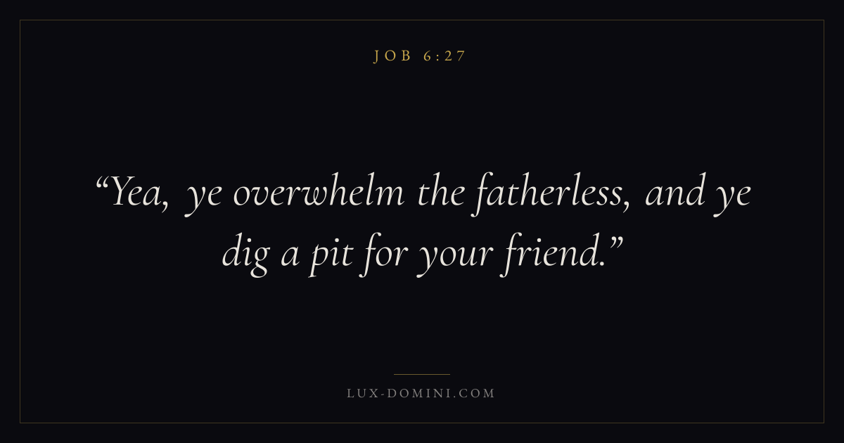 Books / Job / Chapter 6 / Verse 27 ← Job 6:26 Job 6:27 Job 6:28 → Yea, ye overwhelm the fatherless, and ye dig a pit for your friend. Download verse card Share on Twitter Share on Facebook Pin it ✦ Key themes Suffering and trialsWisdomJustice and mercySuffering Read with Job 6:28Romans 8:182 Corinthians 4:17Proverbs 1:7 Related topics Bible verses about suffering and trialsBible verses about wisdomBible verses about justice and mercy ✦ Job Chapter 6 verses V. 1 V. 2 V. 3 V. 4 V. 5 V. 6 V. 7 V. 8 V. 9 V. 10 V. 11 V. 12 V. 13 V. 14 V. 15 V. 16 V. 17 V. 18 V. 19 V. 20 V. 21 V. 22 V. 23 V. 24 V. 25 V. 26 V. 27 V. 28 V. 29 V. 30