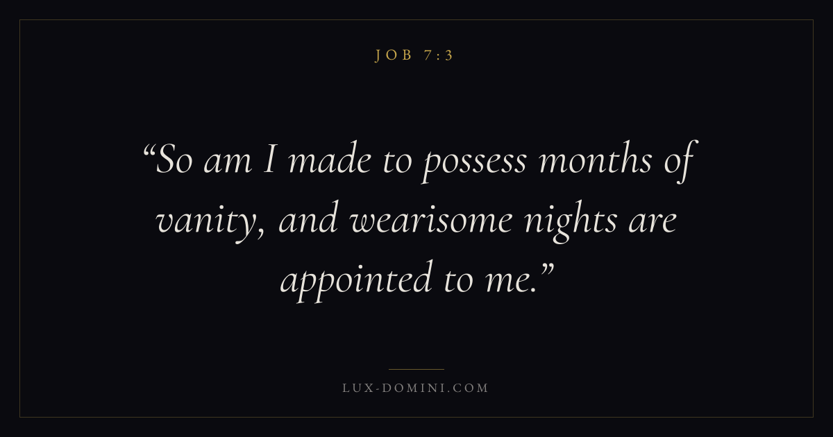 Books / Job / Chapter 7 / Verse 3 ← Job 7:2 Job 7:3 Job 7:4 → So am I made to possess months of vanity, and wearisome nights are appointed to me. Download verse card Share on Twitter Share on Facebook Pin it ✦ Key themes Suffering and trialsWisdomJustice and mercySuffering Read with Job 7:1Job 7:2Romans 8:182 Corinthians 4:17 Related topics Bible verses about suffering and trialsBible verses about wisdomBible verses about justice and mercy ✦ Job Chapter 7 verses V. 1 V. 2 V. 3 V. 4 V. 5 V. 6 V. 7 V. 8 V. 9 V. 10 V. 11 V. 12 V. 13 V. 14 V. 15 V. 16 V. 17 V. 18 V. 19 V. 20 V. 21