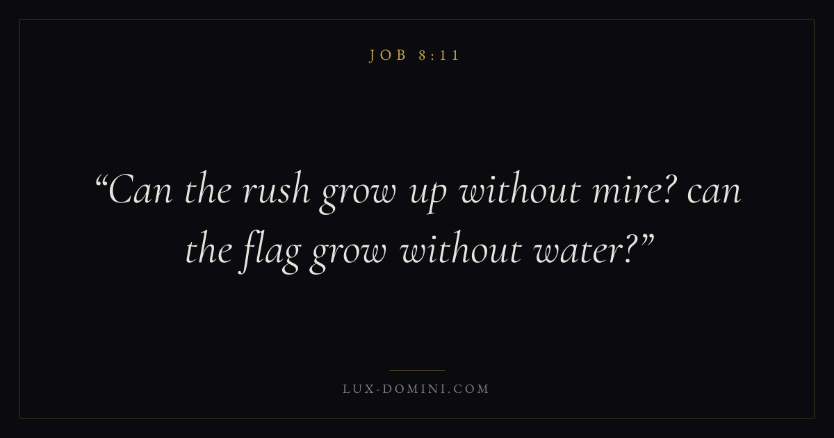 Books / Job / Chapter 8 / Verse 11 ← Job 8:10 Job 8:11 Job 8:12 → Can the rush grow up without mire? can the flag grow without water? Download verse card Share on Twitter Share on Facebook Pin it ✦ Key themes Suffering and trialsWisdomJustice and mercyTruthSuffering Read with Job 8:8Job 8:9Romans 8:182 Corinthians 4:17 Related topics Bible verses about suffering and trialsBible verses about wisdomBible verses about justice and mercyBible verses about truth ✦ Job Chapter 8 verses V. 1 V. 2 V. 3 V. 4 V. 5 V. 6 V. 7 V. 8 V. 9 V. 10 V. 11 V. 12 V. 13 V. 14 V. 15 V. 16 V. 17 V. 18 V. 19 V. 20 V. 21 V. 22