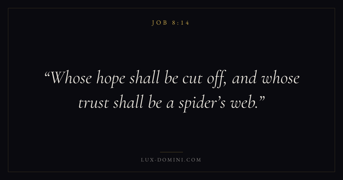 Books / Job / Chapter 8 / Verse 14 ← Job 8:13 Job 8:14 Job 8:15 → Whose hope shall be cut off, and whose trust shall be a spider’s web. Download verse card Share on Twitter Share on Facebook Pin it ✦ Key themes FaithHopeSuffering and trialsWisdomSuffering Read with Job 8:12Job 8:13Hebrews 11:1Romans 10:17 Related topics Bible verses about faithBible verses about hopeBible verses about suffering and trialsBible verses about wisdom ✦ Job Chapter 8 verses V. 1 V. 2 V. 3 V. 4 V. 5 V. 6 V. 7 V. 8 V. 9 V. 10 V. 11 V. 12 V. 13 V. 14 V. 15 V. 16 V. 17 V. 18 V. 19 V. 20 V. 21 V. 22