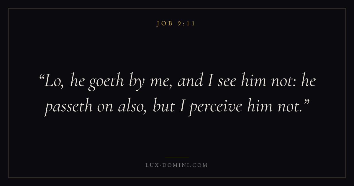 Books / Job / Chapter 9 / Verse 11 ← Job 9:10 Job 9:11 Job 9:12 → Lo, he goeth by me, and I see him not: he passeth on also, but I perceive him not. Download verse card Share on Twitter Share on Facebook Pin it ✦ Key themes Suffering and trialsWisdomJustice and mercySuffering Read with Job 9:12Job 9:13Romans 8:182 Corinthians 4:17 Related topics Bible verses about suffering and trialsBible verses about wisdomBible verses about justice and mercy ✦ Job Chapter 9 verses V. 1 V. 2 V. 3 V. 4 V. 5 V. 6 V. 7 V. 8 V. 9 V. 10 V. 11 V. 12 V. 13 V. 14 V. 15 V. 16 V. 17 V. 18 V. 19 V. 20 V. 21 V. 22 V. 23 V. 24 V. 25 V. 26 V. 27 V. 28 V. 29 V. 30 V. 31 V. 32 V. 33 V. 34 V. 35