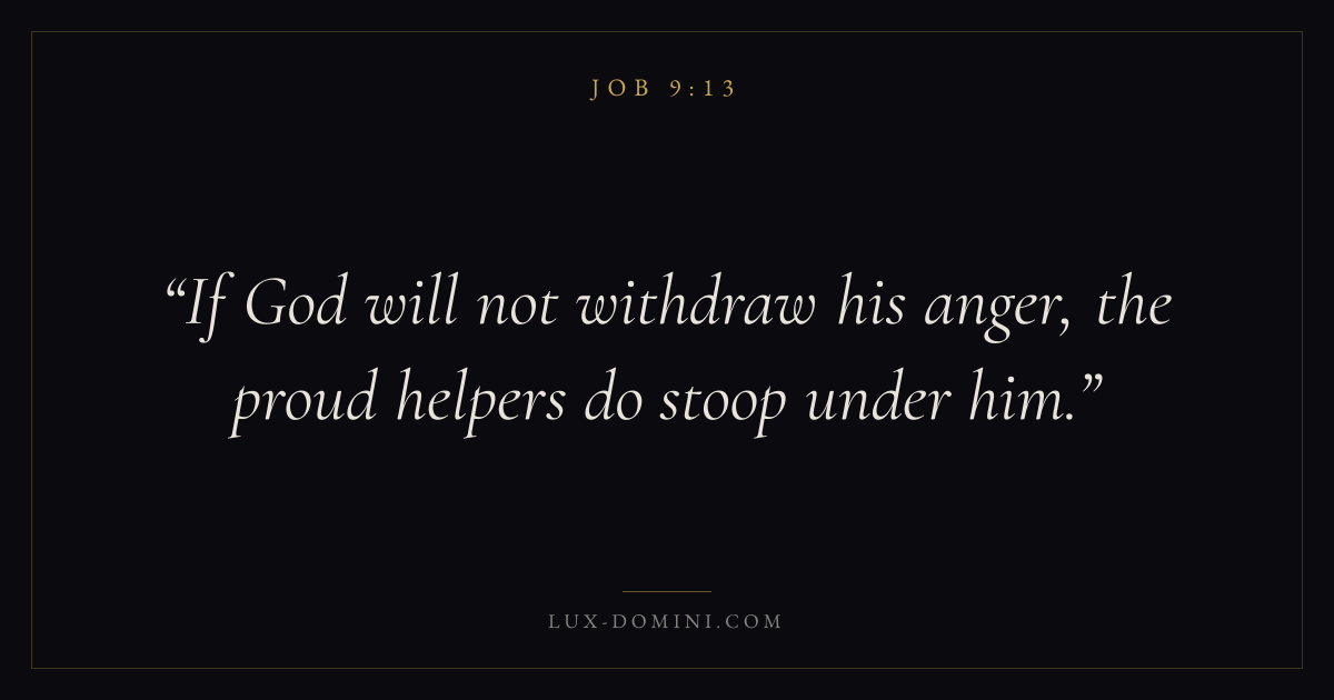 Books / Job / Chapter 9 / Verse 13 ← Job 9:12 Job 9:13 Job 9:14 → If God will not withdraw his anger, the proud helpers do stoop under him. Download verse card Share on Twitter Share on Facebook Pin it ✦ Key themes Suffering and trialsWisdomJustice and mercyHumilitySuffering Read with Job 9:11Job 9:12Romans 8:182 Corinthians 4:17 Related topics Bible verses about suffering and trialsBible verses about wisdomBible verses about justice and mercyBible verses about humility ✦ Job Chapter 9 verses V. 1 V. 2 V. 3 V. 4 V. 5 V. 6 V. 7 V. 8 V. 9 V. 10 V. 11 V. 12 V. 13 V. 14 V. 15 V. 16 V. 17 V. 18 V. 19 V. 20 V. 21 V. 22 V. 23 V. 24 V. 25 V. 26 V. 27 V. 28 V. 29 V. 30 V. 31 V. 32 V. 33 V. 34 V. 35